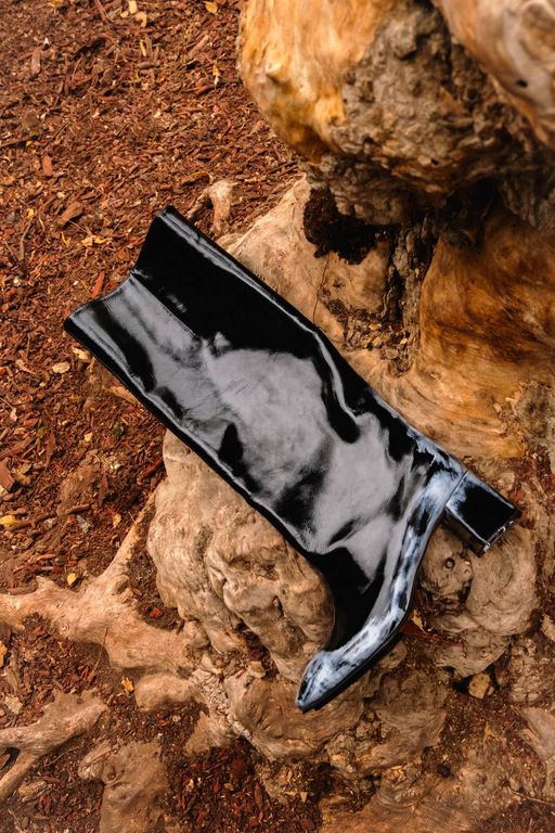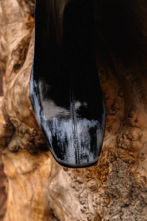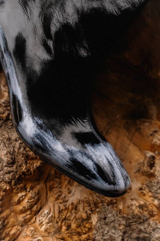 Эти сапоги — как арт-объект. Черный лак с эффектом прокраса будто создан кистью художника: свет играет, переливается, создавая иллюзию движения. Каждая пара уникальна, словно отпечаток настроения.